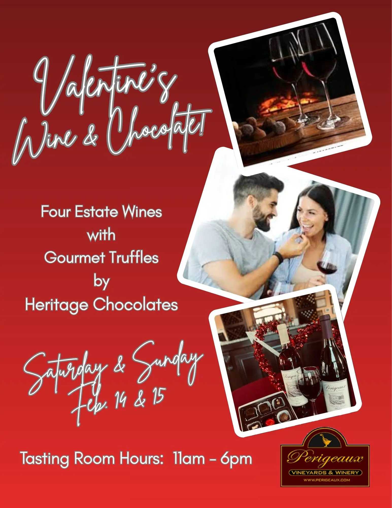 Flight of four estate wines paired with gourmet truffles by Heritage Chocolates. Saturday & Sunday, Feb. 14 & 15 $45/person or $85 per couple